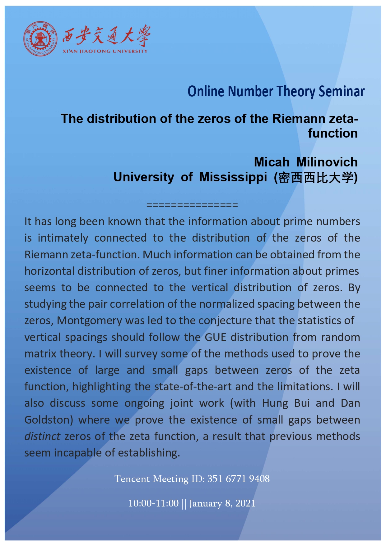 【数论线上论坛】美国密西西比制服做爱 Micah Milinovich教授学术报告通知