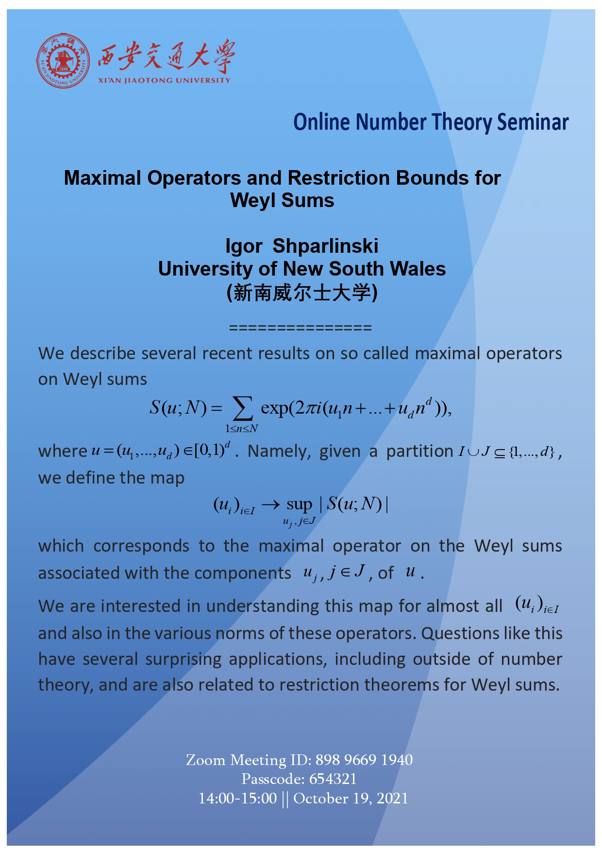 【Online Number Theory Seminar】新南威尔士制服做爱 Igor Shparlinski教授学术报告通知