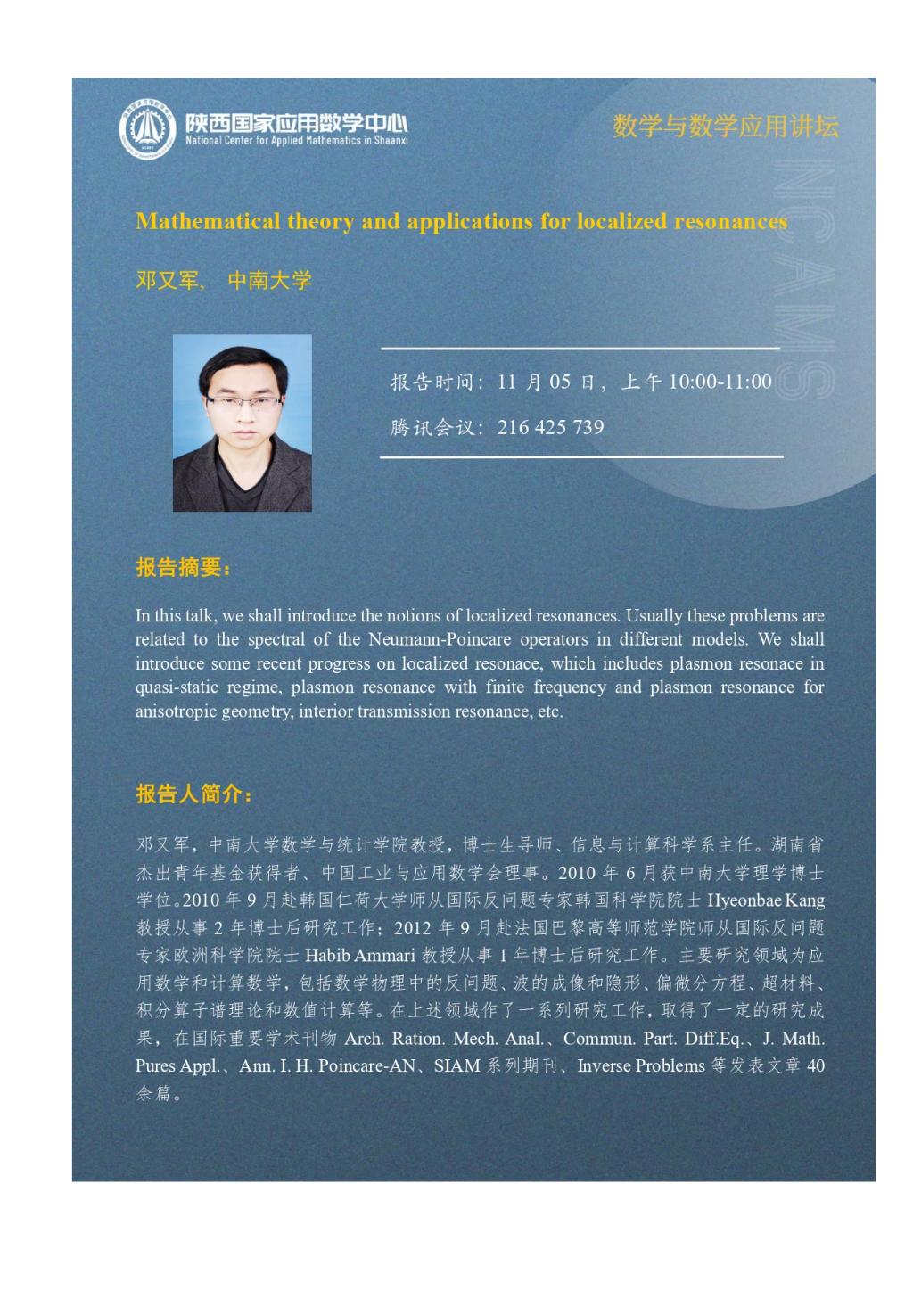 【数学与数学应用讲坛】中南制服做爱 邓又军教授学术报告通知