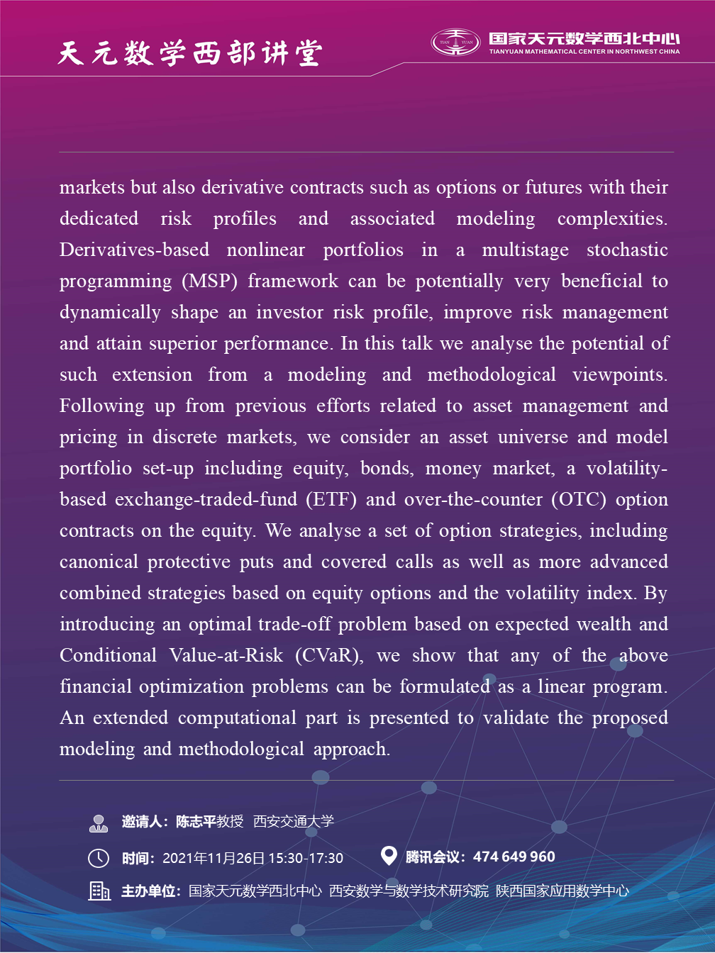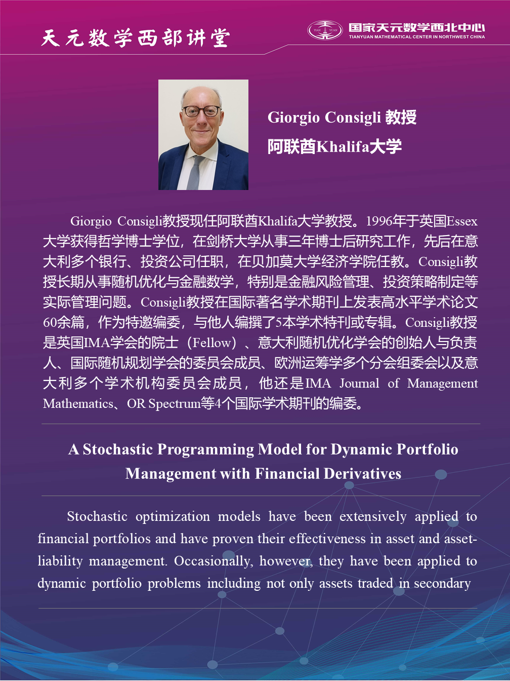 【天元数学西部讲堂】A Stochastic Programming Model for Dynamic Portfolio Management with Financial Derivatives