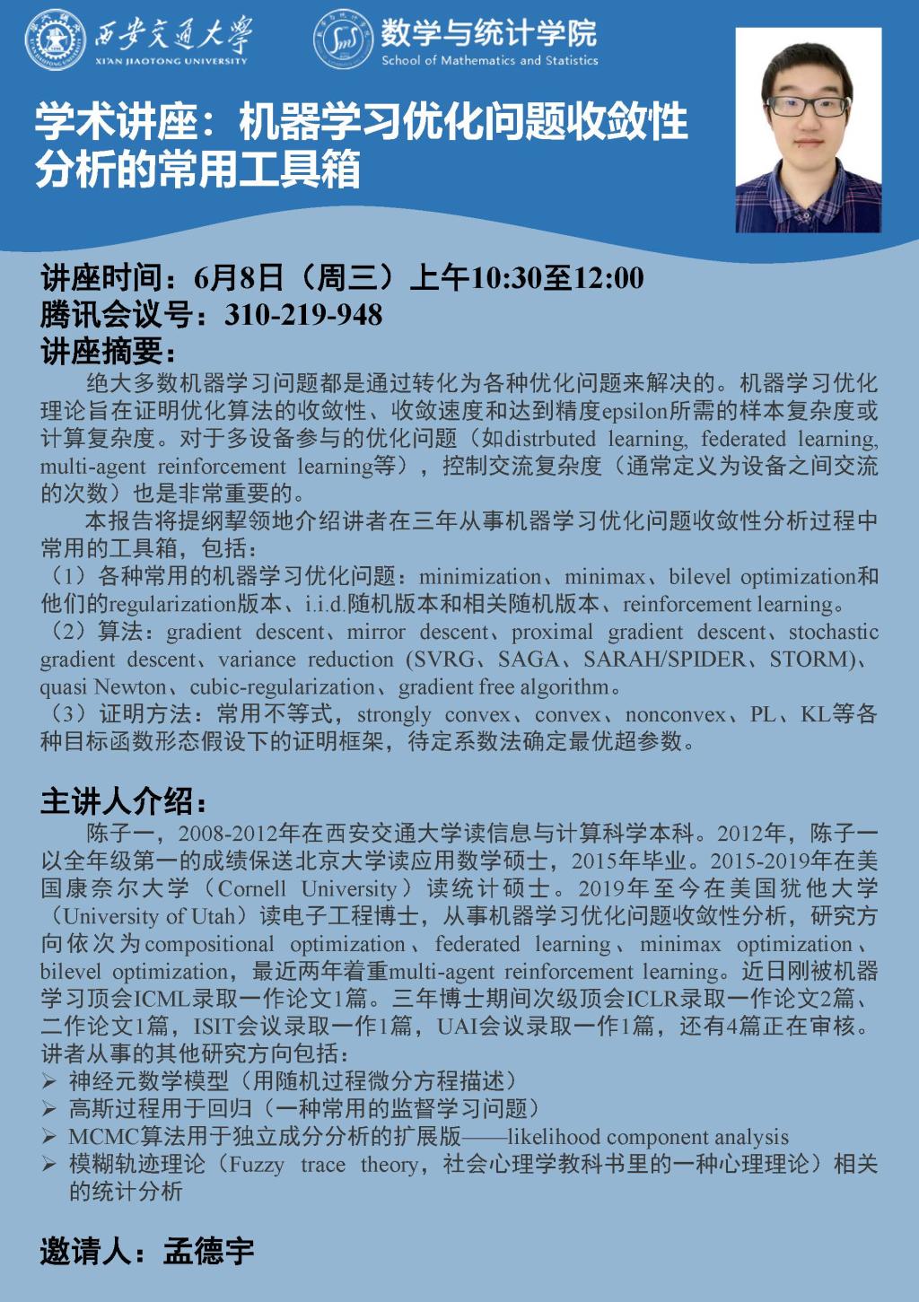 "机器学习优化问题收敛性分析的常用工具箱"学术讲座通知