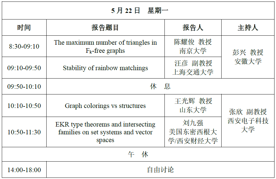王卫教授、鲁红亮教授共同组织召集。本期研讨班针对当前图论及其应用难题,拟邀请极值图论、结构图论、图算法、概率方法等领域专家学者,共同研讨如何发展新的极值图论及代数图论的研究框架,讨论图与超图图兰问题、图的圈问题、拉姆齐数问题及图的染色问题等,探索研究极值图论问题新的随机方法、代数方法、吸收方法,并研讨极值图论及其稳定性问题,以期在极值图论研究领域公开难题研究上取得实质性进展,进而推动国内图论及其应用研究的发展。