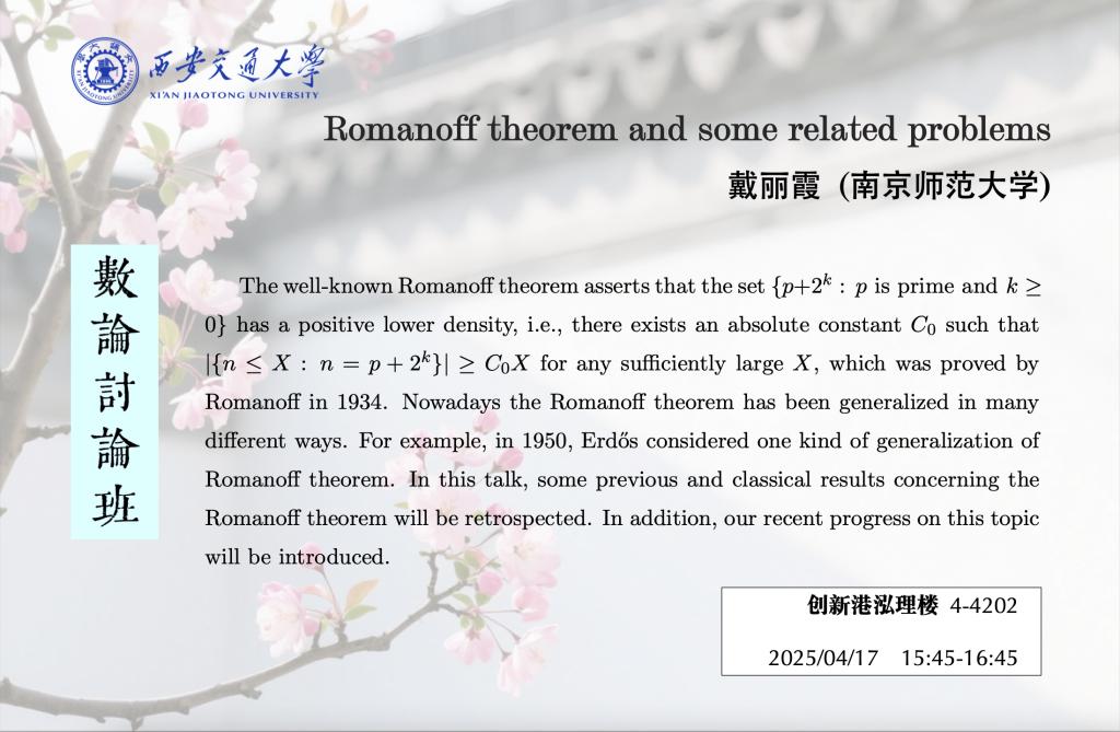 The well-known Romanoff theorem asserts that the set $\left\{p+2^k: p\right.$ is prime and $k \geq$ $0\}$ has a positive lower density, i.e., there exists an absolute constant $C_0$ such that $\left|\left\{n \leq X: n=p+2^k\right\}\right| \geq C_0 X$ for any sufficiently large $X$, which was proved by Romanoff in 1934. Nowadays the Romanoff theorem has been generalized in many different ways. For example, in 1950, Erdős considered one kind of generalization of Romanoff theorem. In this talk, some previous and classical results concerning the Romanoff theorem will be retrospected. In addition, our recent progress on this topic will be introduced.